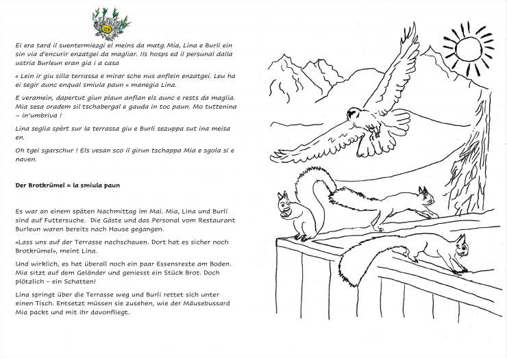Bezugnehmend auf Burlis Malgeschichte Teil 2 begegnen wir auf dem Trail von Burleun nach Brigels dem Bussard, den beiden Krähen Nina und Paul und anderen Tieren.